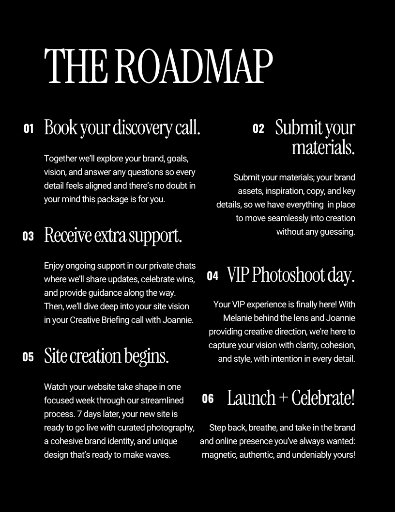 Professional brand photography meets high-end web design in one single package. Two artists; one photoshoot; one website; to manifest the launch of your dreams—in just three weeks.