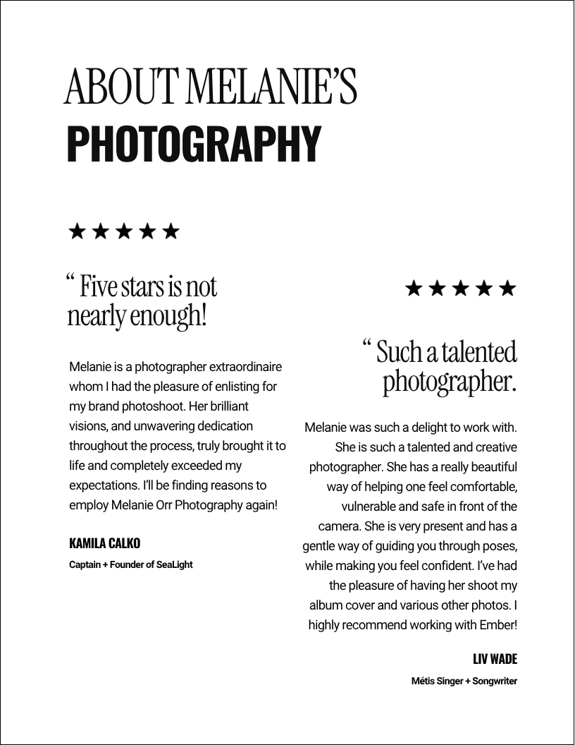 Ember was such a delight to work with. She is such a talented and creative photographer. She has a really beautiful way of helping one feel comfortable, vulnerable and safe in front of the camera. She is very present and has a gentle way of guiding you through poses, while making you feel confident. I’ve had the pleasure of having her shoot my album cover and various other photos. I highly recommend